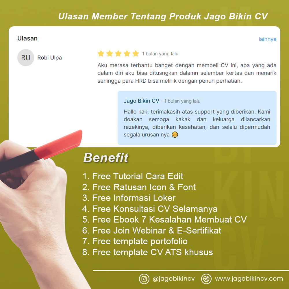 Aku merasa terbantu banget dengan membeli CV ini, apa yang ada dalam diri aku bisa ditusngksn dalamn selembar kertas dan menarik sehingga para HRD bisa melirik dengan penuh perhatian.