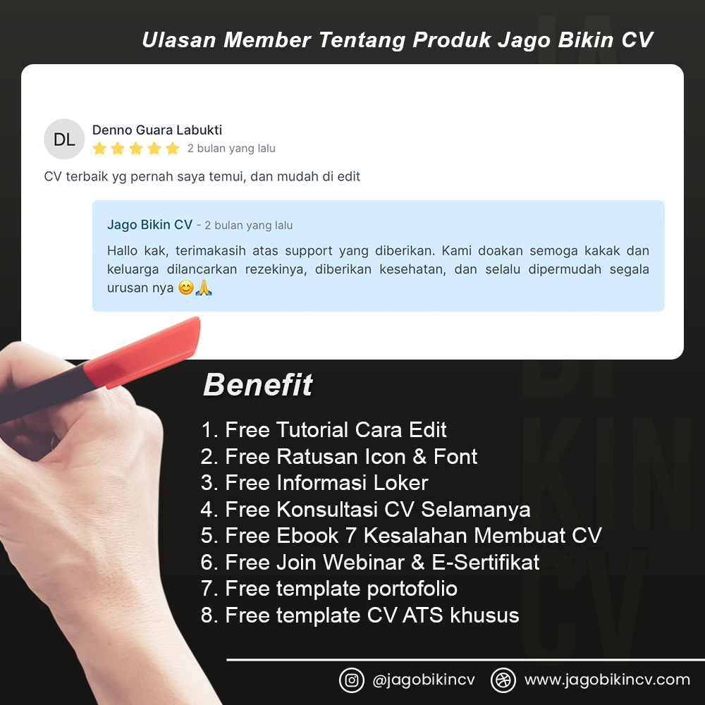 Jagobikincv benar-benar jago bikin CV tinggal klak klik klak klik setelah beli duarr jadilah CV profesional siap pakai dan siap kirim ke perusahaan atau loker impian kalian. makasih mas Nanda Rizky Kurniawan yang telah memudahkan job seeker